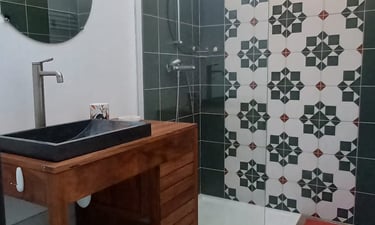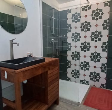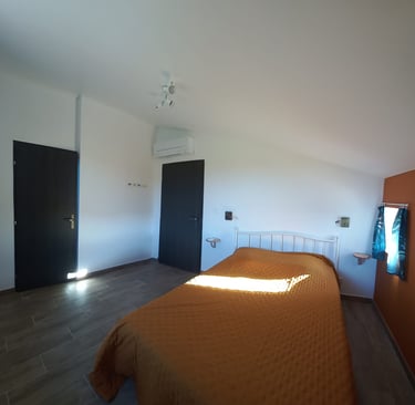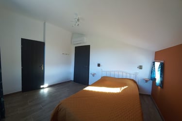 1 chambre climatisée avec 1 lit double, salle de douche et wc séparé